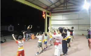 (莲溪村麒麟队麦炽鸿队长在莲溪戏台指导孩子们学习麒麟舞和醒狮武术)