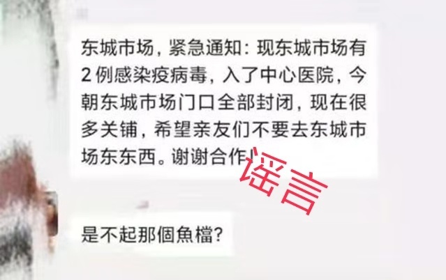 东城街道核查后发现,东城市场未出现微信群所指的感染病例情况,经营秩序正常。目前,市场管理方已报警,要求对造谣者进行追责。