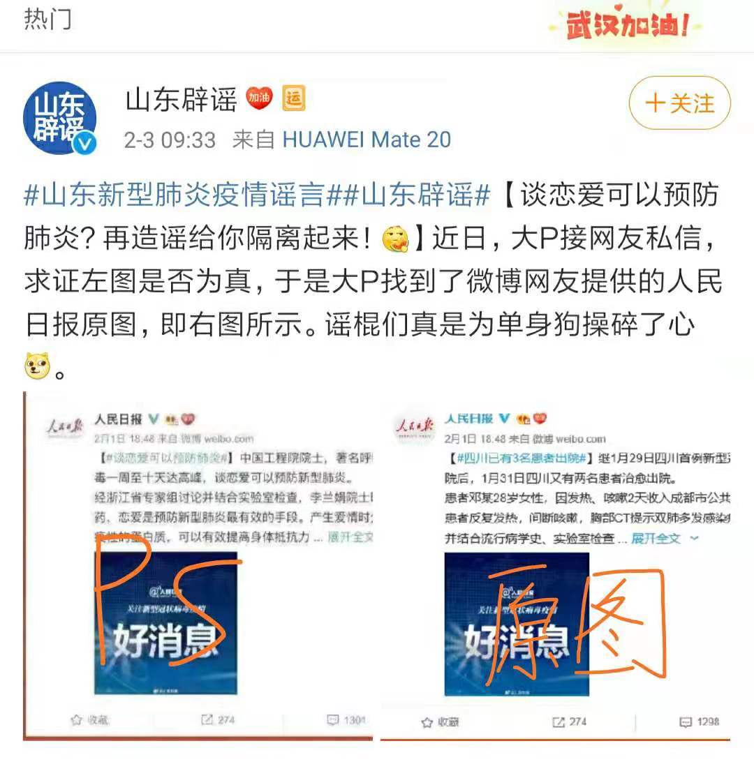 对此,山东省互联网违法和不良信息举报中心官方微博@山东辟谣找到了人民日报的微博原图,内容为“四川已有3名患者出院”,而网传“谈恋爱可以防病毒”为网友PS图片,“谣棍们真是为单身狗操碎了心”,“再造谣给你隔离起来”。