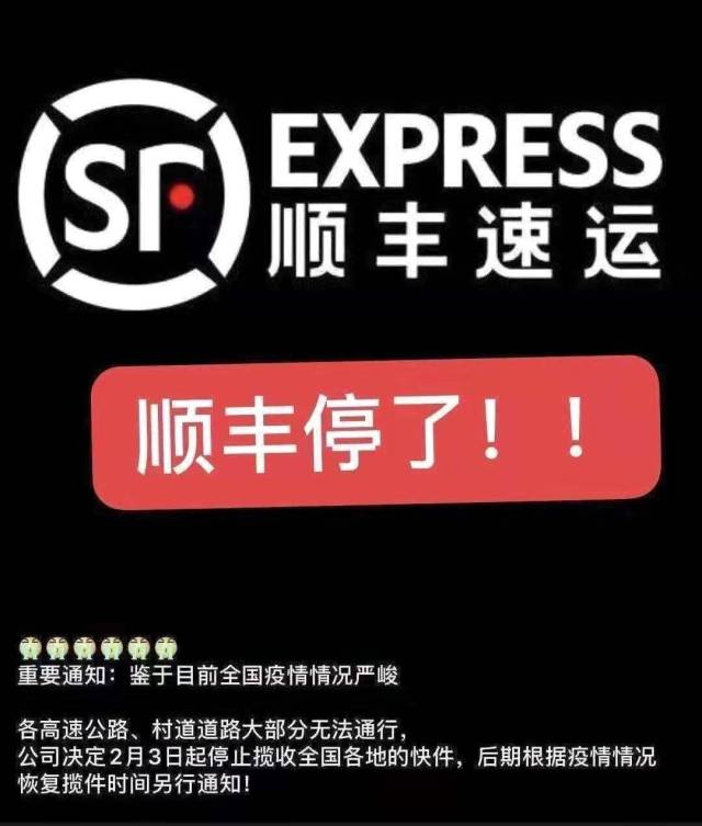 2月3日,在社交网络上盛传顺丰速递从当天起停运的消息,据网传的图片显示,顺丰速递以“全国多处道路无法通行”为由,声称从2月3日开始停止快递服务。