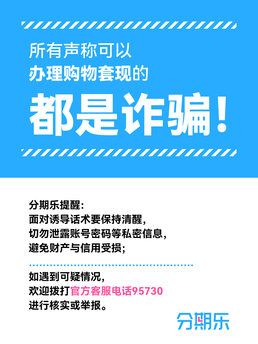 分期乐打击黑灰产专项负责人表示,分期乐对金融黑灰产秉持“零容忍”态度,将持续增强治理力度,坚决切断非法利益链。分期乐提醒广大用户:所有声称可以办理购物套现的都是诈骗。面对金融黑灰产诱导话术要保持清醒,切勿泄露账号密码等私密信息。如遇到可疑情况,可拨打官方客服电话95730进行核实或举报。