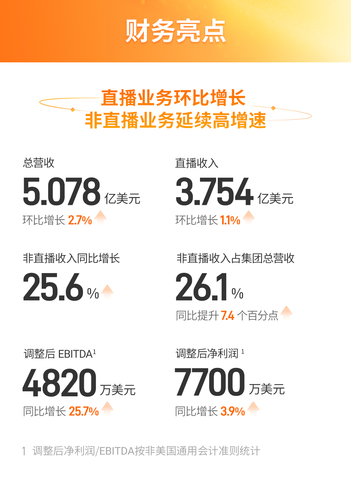 北京时间2025年8月27日,欢聚集团(NASDAQ:JOYY,简称“欢聚”/“集团”)发布2025年第二季度财报。第二季度,欢聚集团收入5.08亿美元,环比增长2.7%,其中,直播业务收入环比增长1.1%;非直播收入同比增长25.6%,占集团营收总比例增长至26.1%。调整后EBITDA(息税折旧摊销前利润)达4820万美元,同比增长25.7%,环比增长19.3%。调整后净利润达7700万美元,同比增长3.9%,环比增长21.8%。同时,集团本季度经营性现金流达5760万美元;截至6月30日,净现金为33亿美元,保持了强劲的财务韧性和流动性。