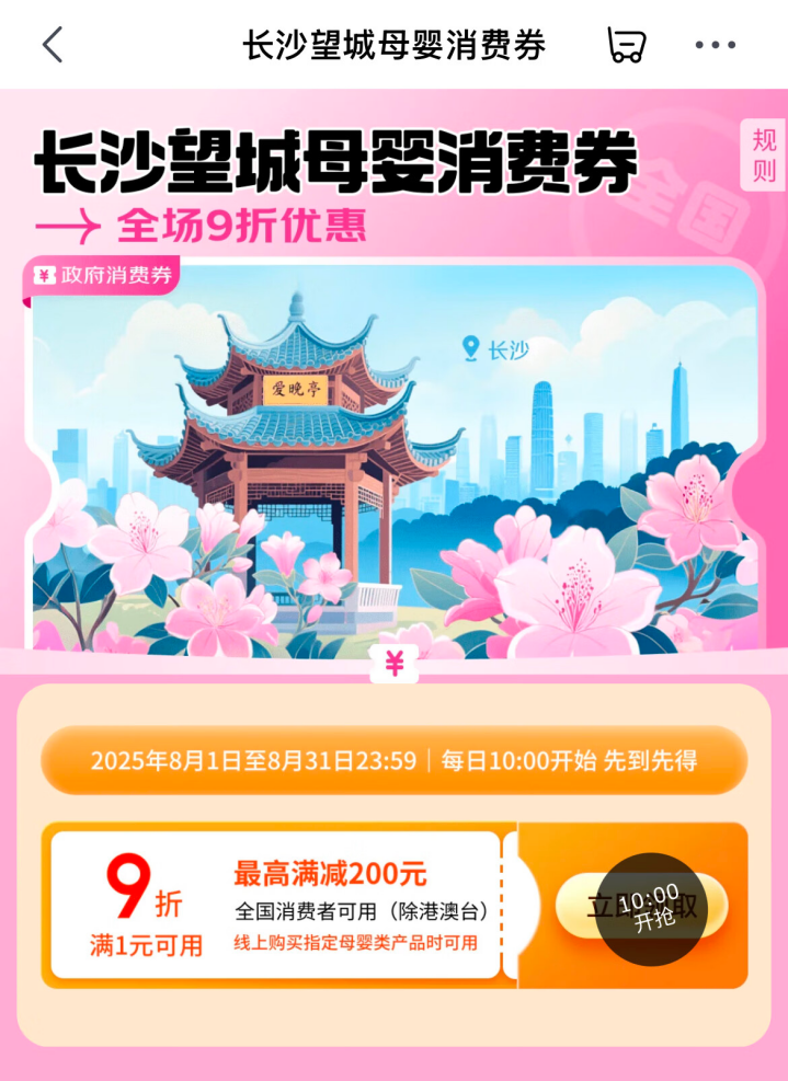 8月1日至20日,湖南省长沙市望城区政府联合京东超市发放母婴消费券,覆盖奶粉、尿裤、婴童洗护等八大母婴品类的700多家品牌近3万款母婴商品。此次消费券全国通用,领取后可以在商品实付金额上补贴立减10%,可以满足全国消费者的全周期育儿需求。
