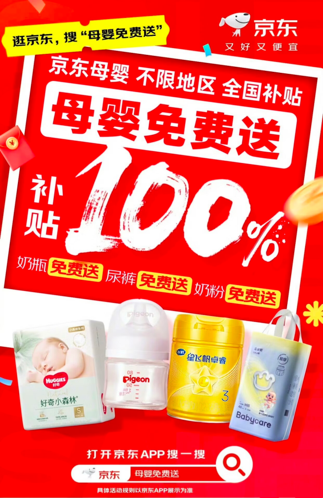 数据显示,自2024年以来,京东超市已联合80家品牌,累计帮助493万个家庭节省育儿开支3亿元。其中,尿裤免费送项目已累计为388万育儿家庭免费提供1.8亿片纸尿裤,奶粉免费送项目已为100万家庭免费送出2700万奶粉产品,奶瓶免费送项目计划年内送出100万支奶瓶。