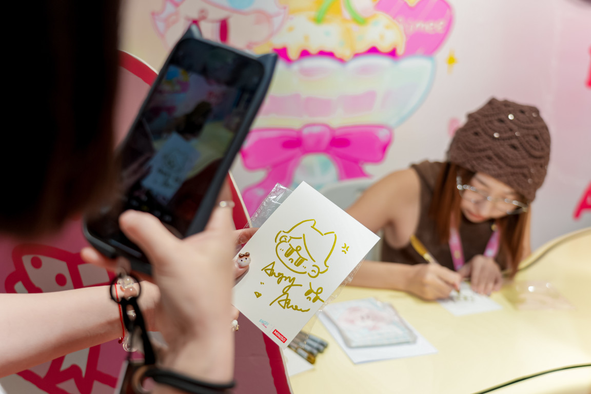 活动期间,多款限定产品同步首发,包括“情人节,NO!吊卡”“沙滩音乐节搪胶毛绒盲盒”以及“哄不好的400%大娃”等,融合磁吸互动、刮刮卡抽签等创新玩法,吸引大量粉丝现场打卡抢购。气宝设计师也亲临现场举办签售活动,与粉丝、顾客交流分享,并表示希望能从粉丝的反馈里获取“灵感”,设计出更加具有温度和情绪价值的气宝新作品。