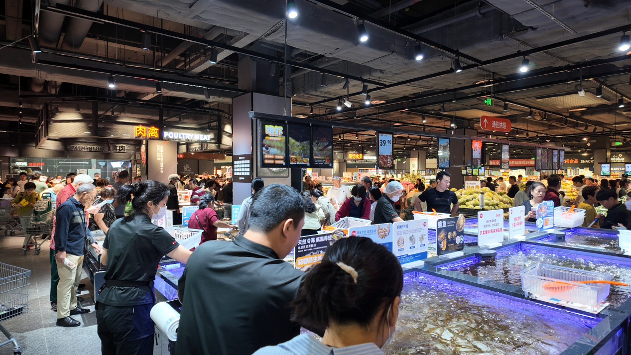 作为深港消费融合的前沿阵地,两家门店的生猛海鲜区成为港澳旅客“必买清单”的打卡点。每日清晨从吉林、湛江、大连渔港直运的帝王蟹、黑虎虾、生蚝堆成“海鲜小山”,开市即引发抢购热潮。来自香港的陈女士提着刚捞的生蚝感叹:“这里的海鲜比香港街市还新鲜,价格却便宜三成,真正‘平靓正’!”