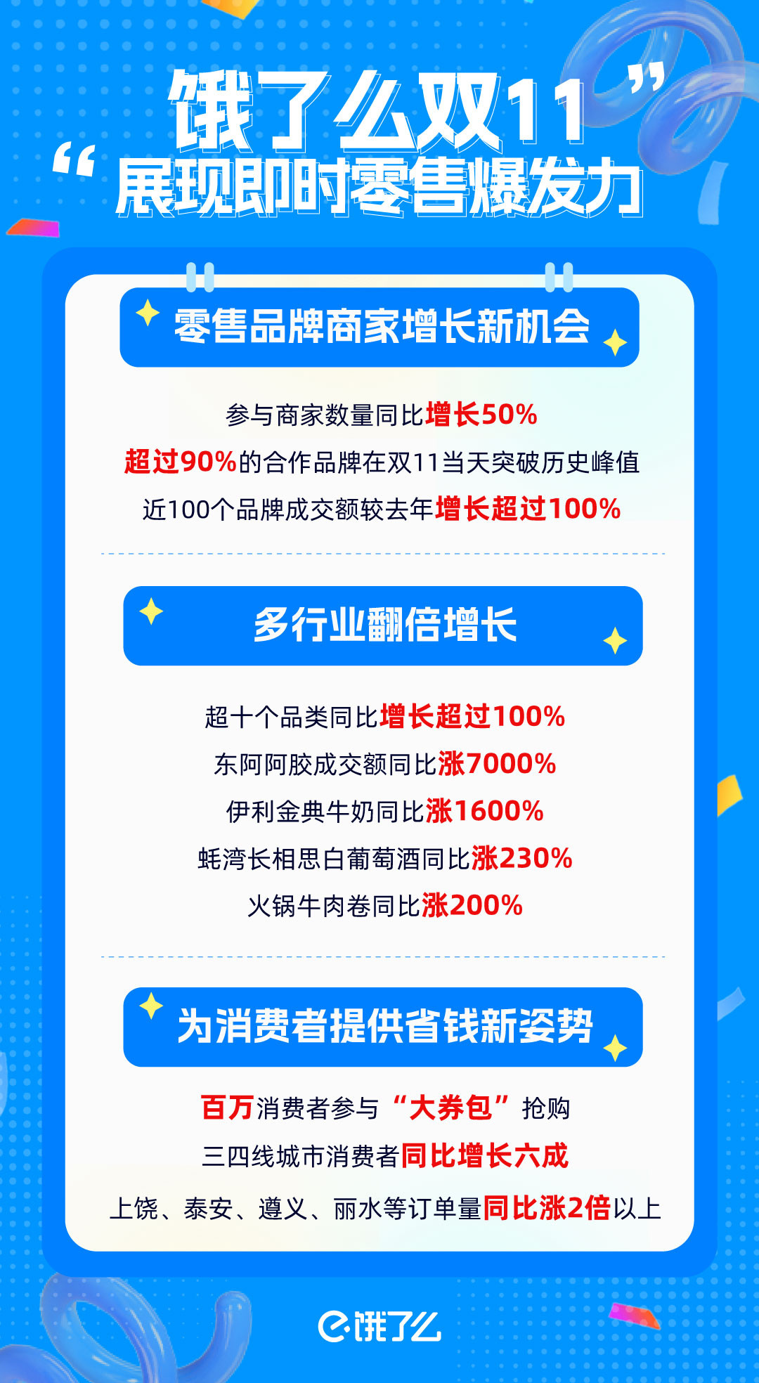 从饿了么各品类成交数据来看,更多行业在今年双11获得了新增长。其中,3C数码成交额同比增长12倍,家用电器增长近3倍,酒水、服饰鞋包、玩具潮玩等超过十个品类成交均翻一倍及以上。10月28日起,饿了么陆续上线纸品、粮油、母婴、乳饮、零食等十大品类优惠日活动。数据显示,借品类日的爆发,各行业热门商品均有明显的增长。其中,东阿阿胶成交额同比涨超过70倍,特仑苏有机纯牛奶增长15倍,皇家美素佳儿奶粉涨8倍,蚝湾长相思白葡萄酒、伊利金典纯牛奶、火锅牛肉卷等单品均增长超过2倍。