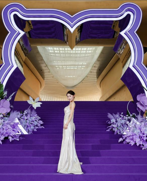 杨冰怡白色拖尾长裙极具设计感,立体花瓣让裙身既浪漫又富有层次,整个人宛如优雅的花中精灵,极尽甜美与梦幻。