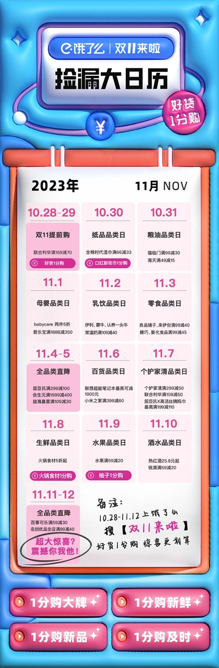 10月28日,饿了么宣布双11大促开启。今年双11,饿了么将主打11万份“好货1分购”,并上线纸品、粮油、母婴、乳饮、零食等十大品类优惠日活动。即日起至11月12日,消费者在饿了么APP搜索“双11来啦”,即可参与这场“24小时不打烊、即时送达”的优惠,同时享受慢必赔、极速退等服务。