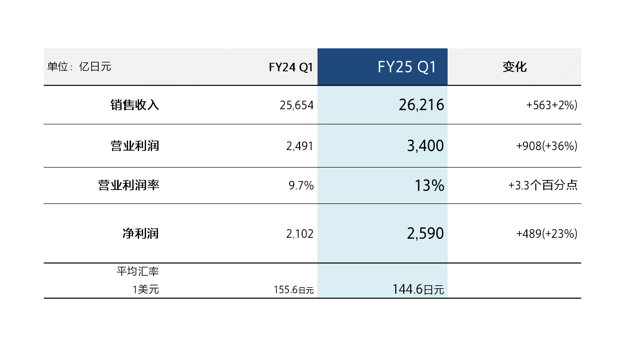 2025财年第一季度,索尼集团销售收入达到26,216亿日元,较去年同期增长2%;营业利润达3,400亿日元,同比增长36%;净利润为2,590亿日元,同比增长23%;营业利润率达13%,较去年同期增长3.3个百分点。在本财年,索尼集团各项业务表现稳健,游戏与网络服务业务方面,非第一方游戏软件销售增长和网络服务销售均有所增长;音乐业务在流媒体音乐收入与移动游戏的收入增长,业务整合亦带来利好;影视业务在电视剧交付量及电影片库的收入有所增长;影像与传感业务方面,移动和数码相机图像传感器销售增长及产品组合优化带来收入增长。索尼集团上调2025财年营业利润预期至14,000亿日元。