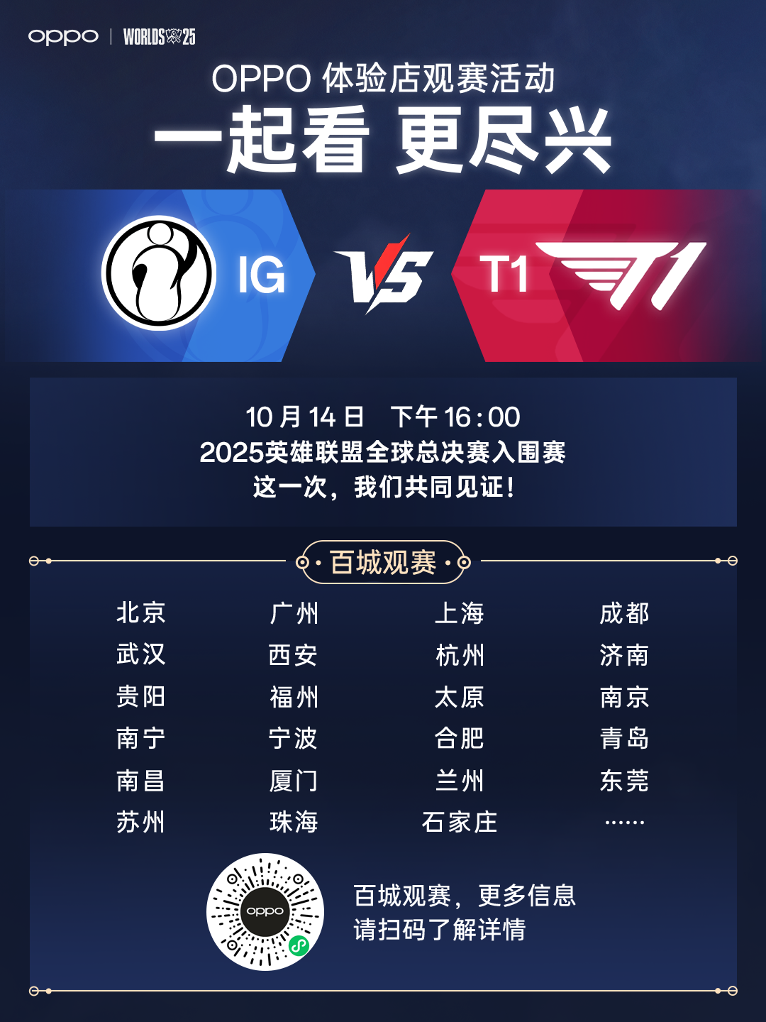 2025年10月14日,随着2025英雄联盟全球总决赛入围赛焦点战——IG对阵T1的正式打响,一场覆盖全国的电竞狂欢也同步拉开序幕。作为2025英雄联盟全球总决赛全球合作伙伴,OPPO举办的“百城门店观赛”活动在全国上百座城市火热开启,成千上万的玩家与电竞爱好者涌入OPPO线下门店,共同见证了这场巅峰对决。