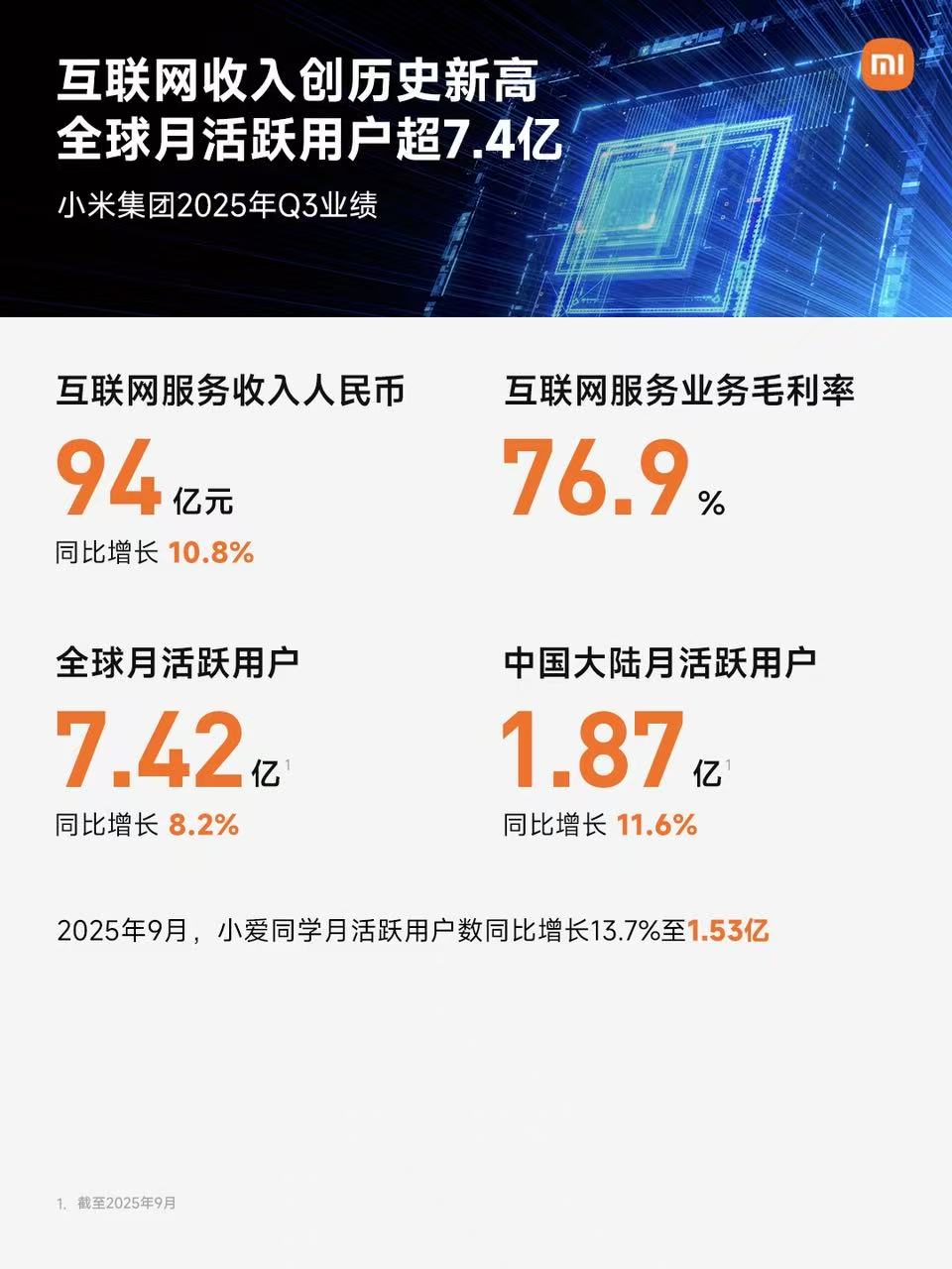 互联网服务业务持续保持健康增长,用户规模持续扩大。三季度小米互联网服务业务收入达94亿元,同比增长10.8%,创历史新高,毛利率达到76.9%。截至2025年9月,小米全球月活跃用户数达7.42亿、中国大陆月活跃用户达1.87亿,均创历史新高。其中,境外业务收入增长亮眼,Q3境外互联网服务收入达33亿元,同比增长19.1%,境外互联网收入在整体互联网收入中占比达34.9%,创历史新高。