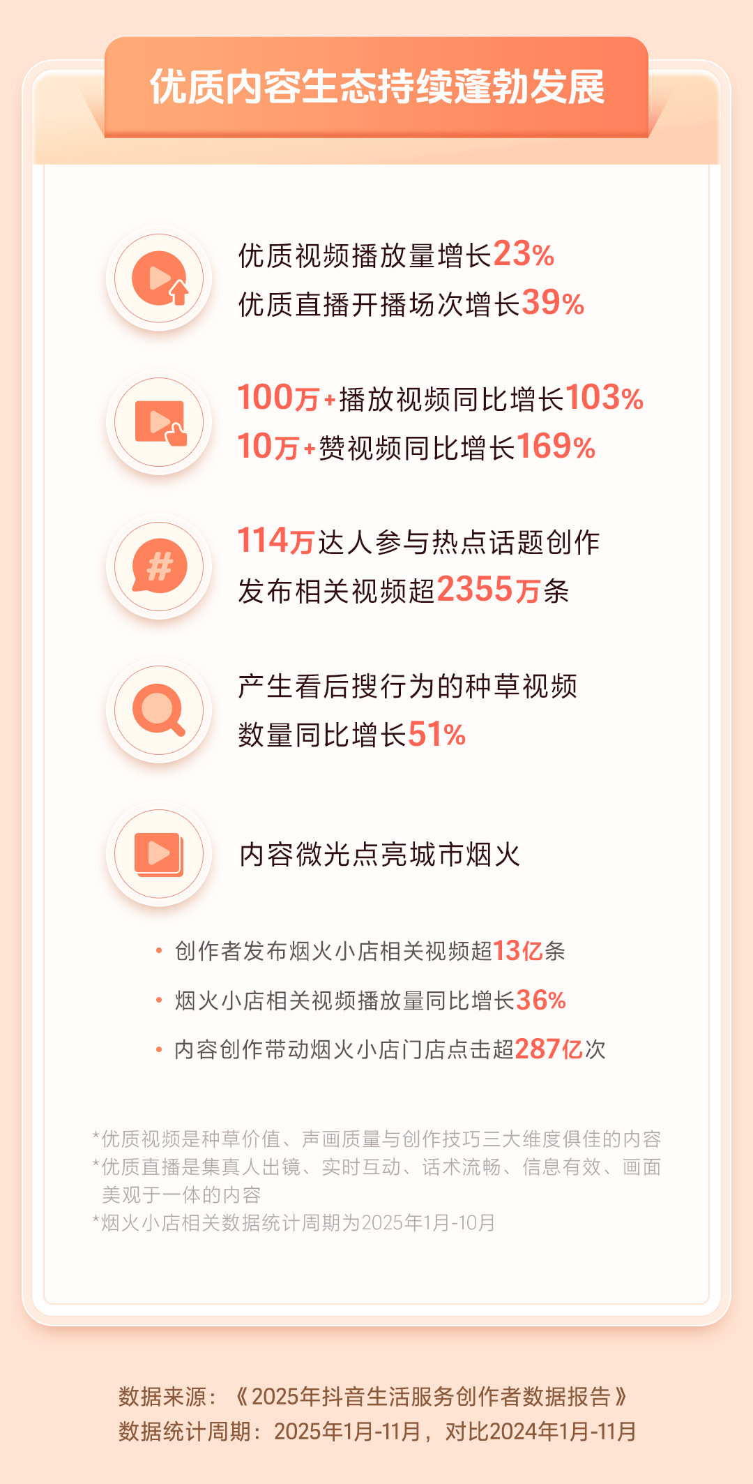 报告显示,抖音生活服务优质内容生态持续繁荣,为区域消费注入新动能。抖音平台今年明确了优质视频与直播标准:视频需兼具种草价值、声画质量与创作技巧;直播则需要符合真人出镜和实时互动等多重标准。年内,平台优质视频播放量提升23%,优质直播开播场次增长39%,生态质量与影响力同步增强。