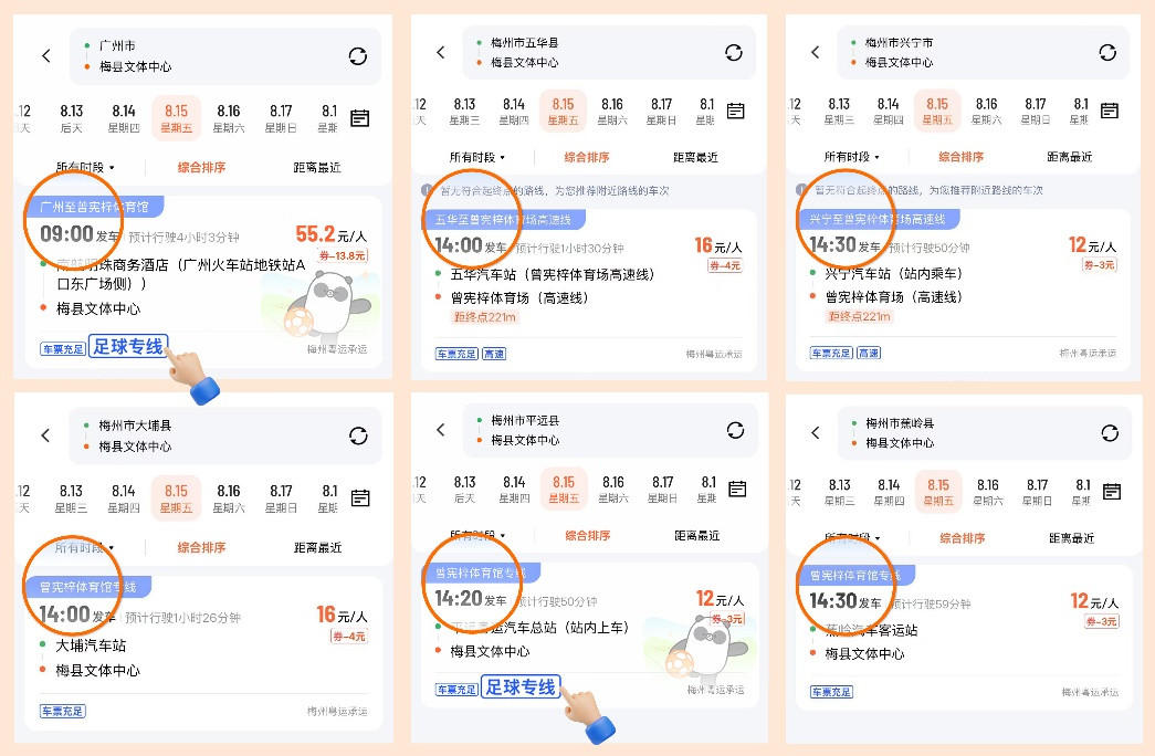 一是广州往返梅州,滴滴巴士在两城之间已有的跨城路线基础上,额外增设了广州直达梅县文体中心的线路,方便省外球迷可以落地广州之后,直接转到比赛场地——曾宪梓体育场,避免多种换乘,省时高效;二是,同时为了让本地球迷在家门口尽兴看球,滴滴巴士增设了梅州往返周边县区的线路,覆盖5个县区,包含梅州往返大埔、兴宁、五华、平远、蕉岭。