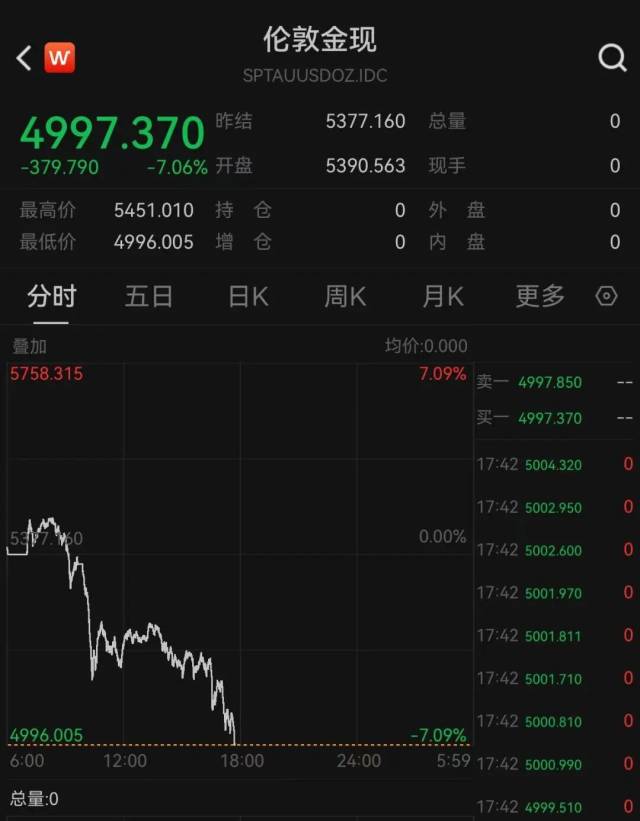 30日下午,现货黄金持续下挫,跌破5000美元/盎司,跌超7%。