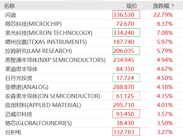 美股存储概念股大涨,闪迪涨22.79%股价创盘中历史新高,美光科技涨7%,报334美元/股,再创历史新高,总市值突破3700亿美元。微芯科技涨超8%。