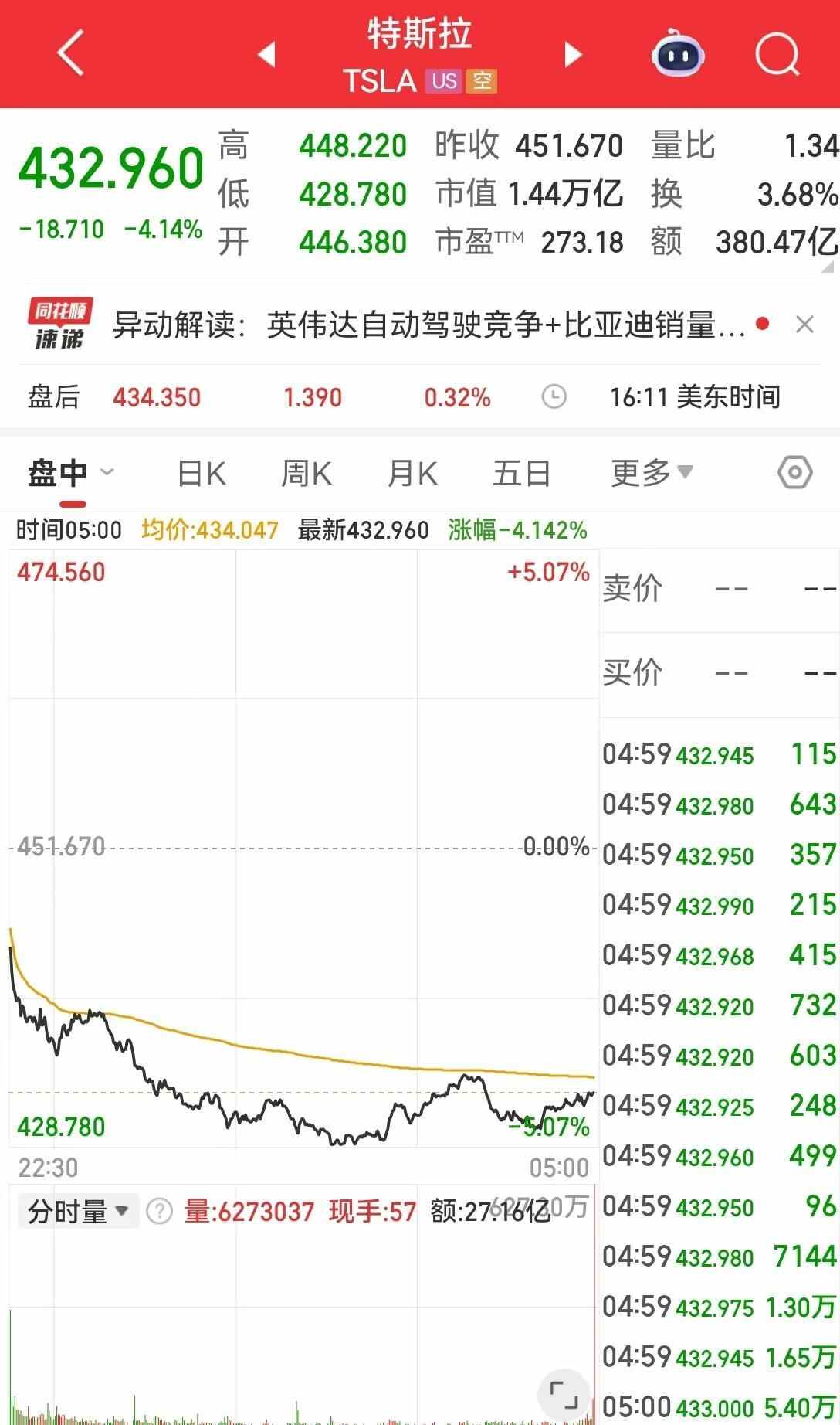 特斯拉跌超4%,报432.96美元,最新市值1.44万亿美元,其市值一夜蒸发662.30亿美元(约合人民币4346亿元)。