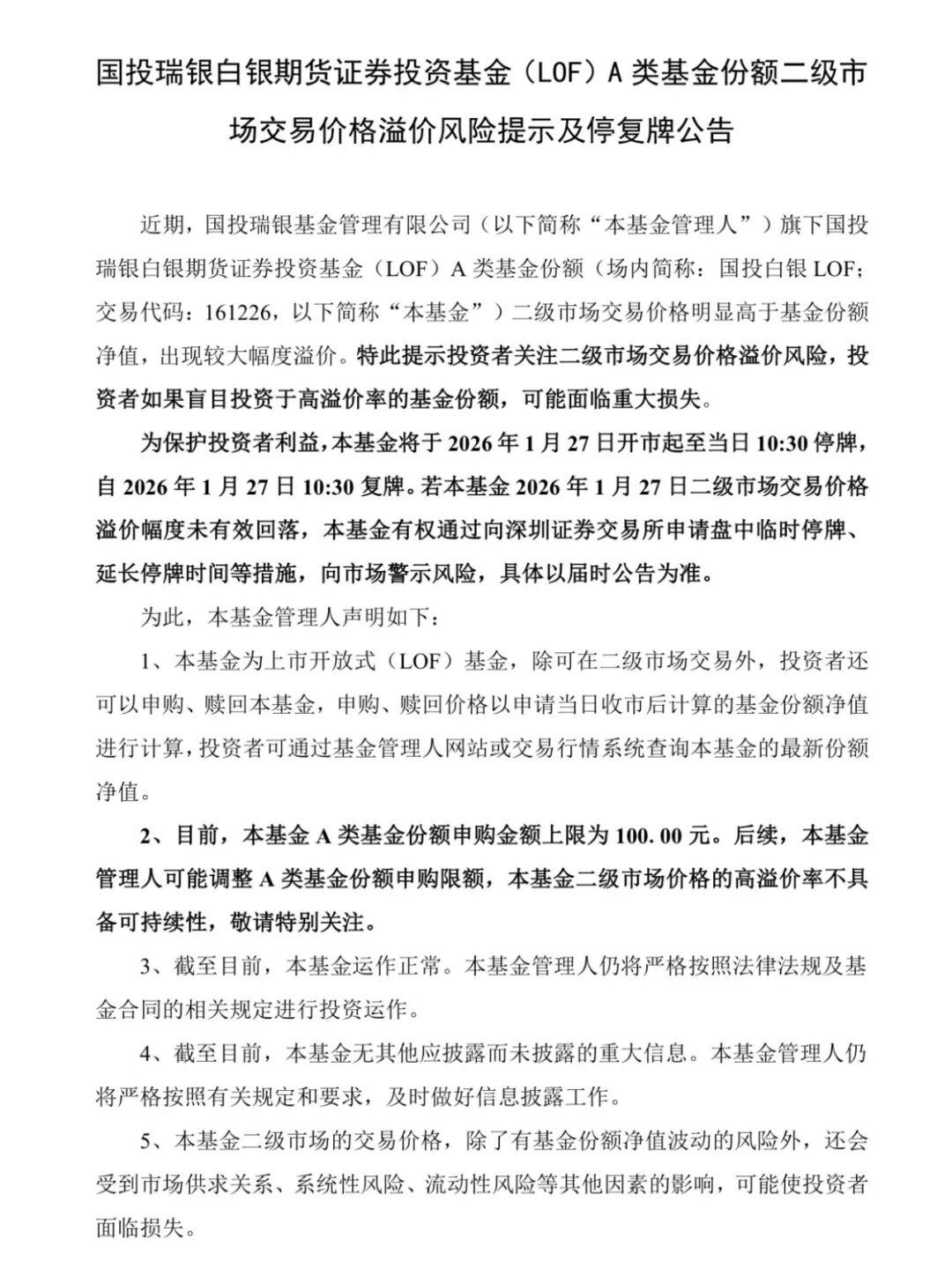 1月26日晚间,国投白银LOF(161226)公告,将于2026年1月28日起暂停申购(含定期定额投资)业务。