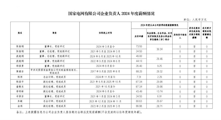 其中,国家电网有限公司董事长、党组书记张智刚2024年1月至3月所任职务为董事、总经理、党组副书记,2024年3月起升任董事长、党组书记,故2024年度应付年薪随职务划分为两项,两项合计应付年薪总额为98万元,位列第一。