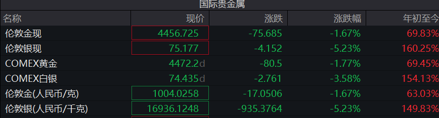 此外,大幅上调保证金将显著提升市场投机交易成本,部分投资者赶在新规生效前获利了结,引发国际金属期货价格在29日出现多轮下跌。当天亚洲交易尾盘时段,国际贵金属价格跌幅再度扩大,国际金价跌破每盎司4500美元整数关口。