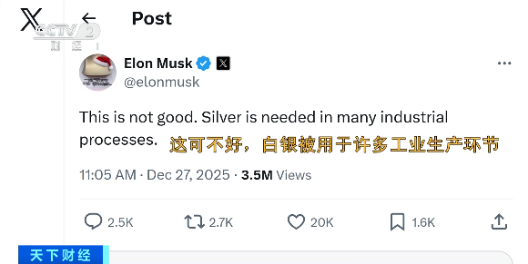 12月27日,特斯拉首席执行官埃隆·马斯克也对白银价格上涨表示担忧。他在社交媒体平台发帖称:“这可不好。白银在许多工业生产过程中都必不可少。”