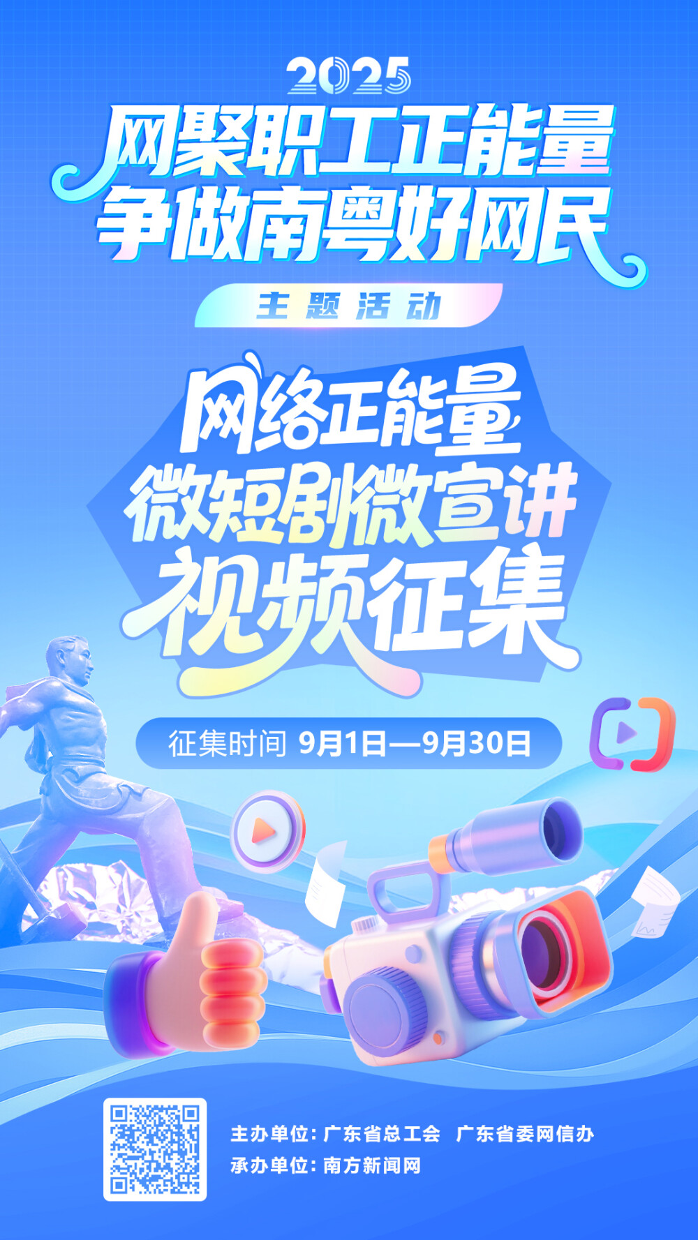 可通过广东省总工会网站、广东省总工会微信公众号、南方网、粤学习客户端,进入【2025年“网聚职工正能量 争做南粤好网民”主题活动——网络正能量微短剧微宣讲视频征集】活动页面,点击【立即参加】提交作品。