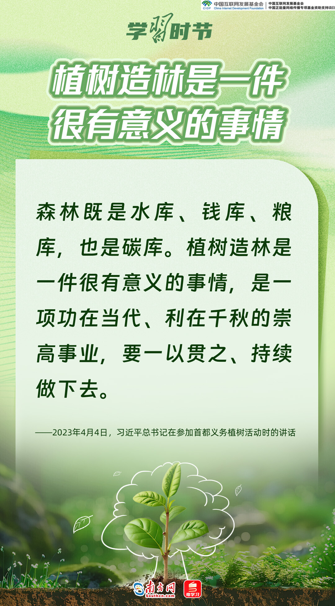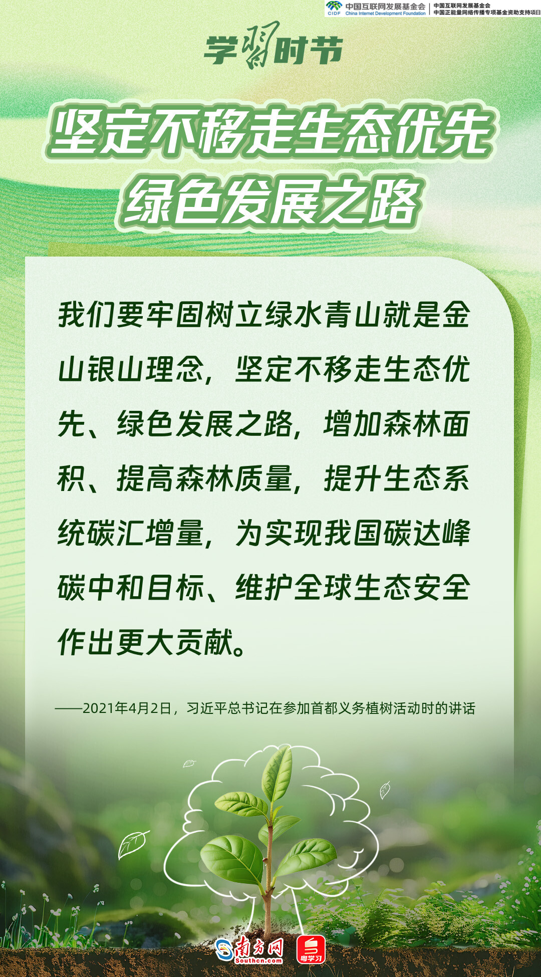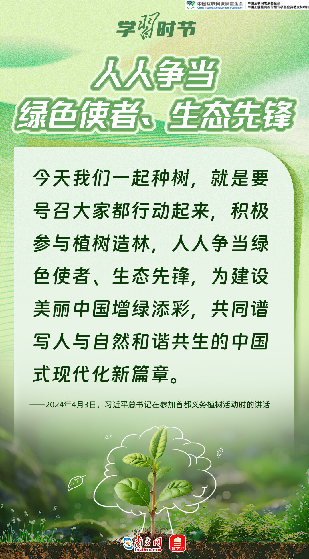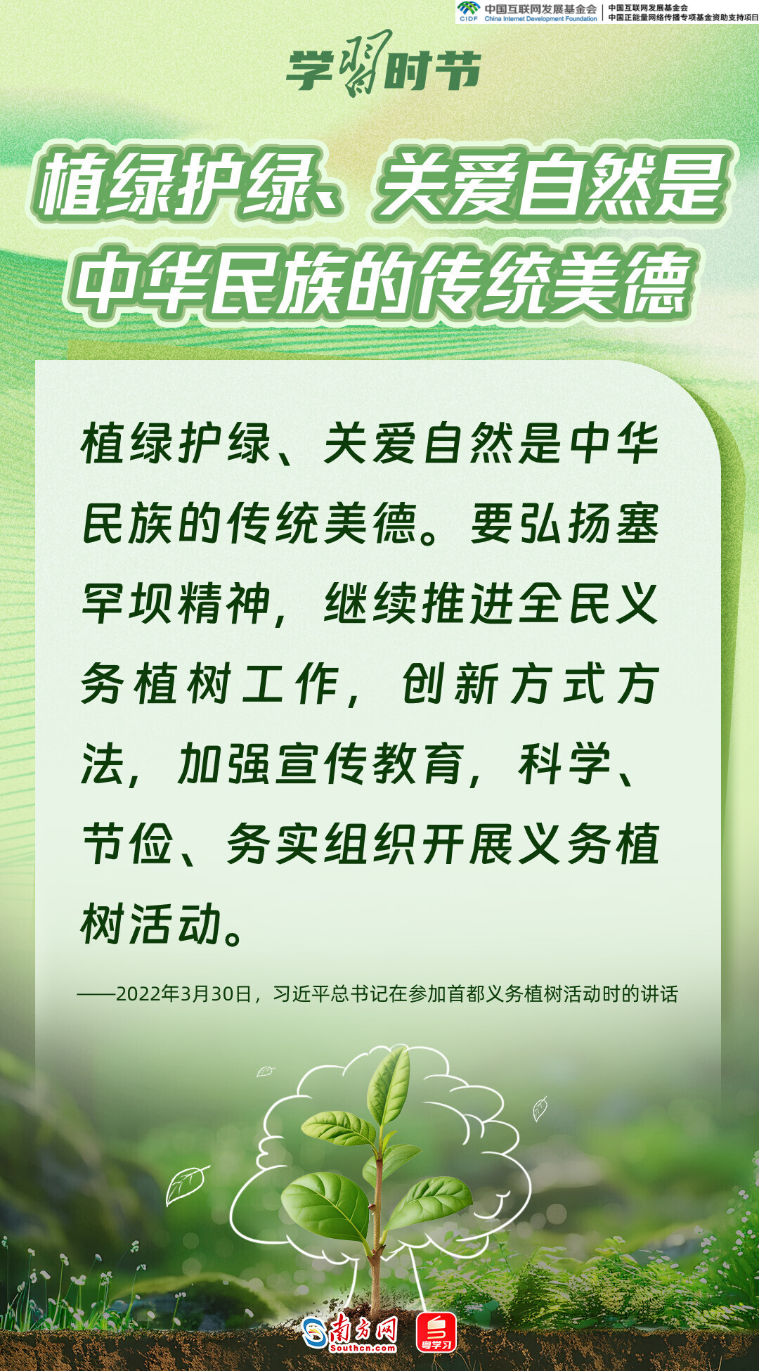 生态文明建设是关系中华民族永续发展的根本大计,而绿色,正是加快生态文明建设、推动中国高质量发展的底色和重要标志。党的十八大以来,习近平总书记每年春天都会参加首都义务植树活动,率先垂范、身体力行,大力倡导人人爱绿植绿护绿的文明风尚,推动美丽中国建设转化为人民自觉的行动,共同谱写人与自然和谐共生的中国式现代化新篇章。又是一年植树节,让我们一同感悟习近平总书记的“绿色”情怀。