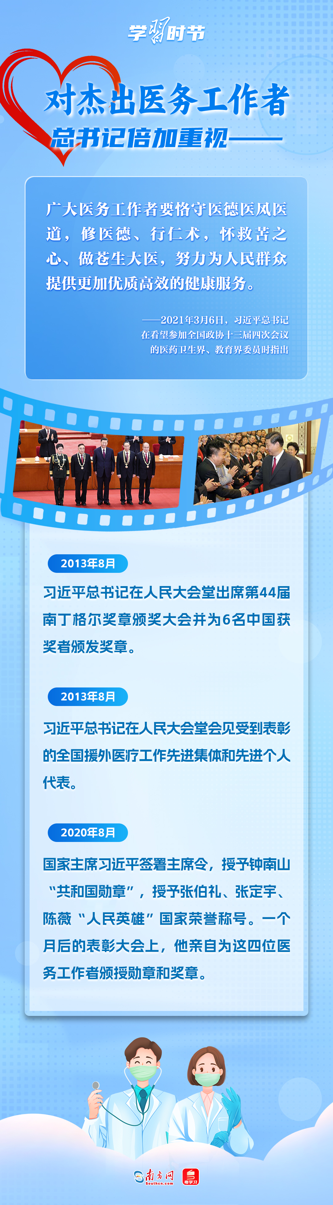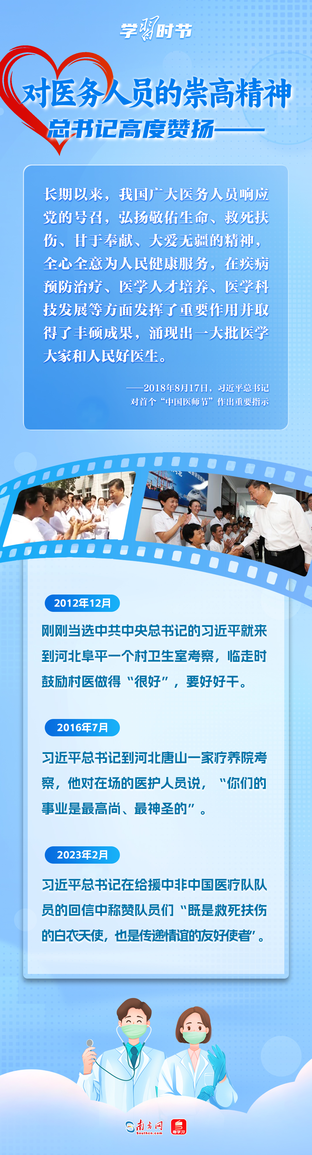 党的十八大以来,习近平总书记一直高度肯定和评价广大医务人员的工作,在多个场合表达过对这个群体的关爱与鼓励,引领全党全社会形成尊医重卫的良好风气。今年8月19日是第八个中国医师节,让我们一同回顾这些温暖瞬间,感受习近平总书记对医务工作者的牵挂。
