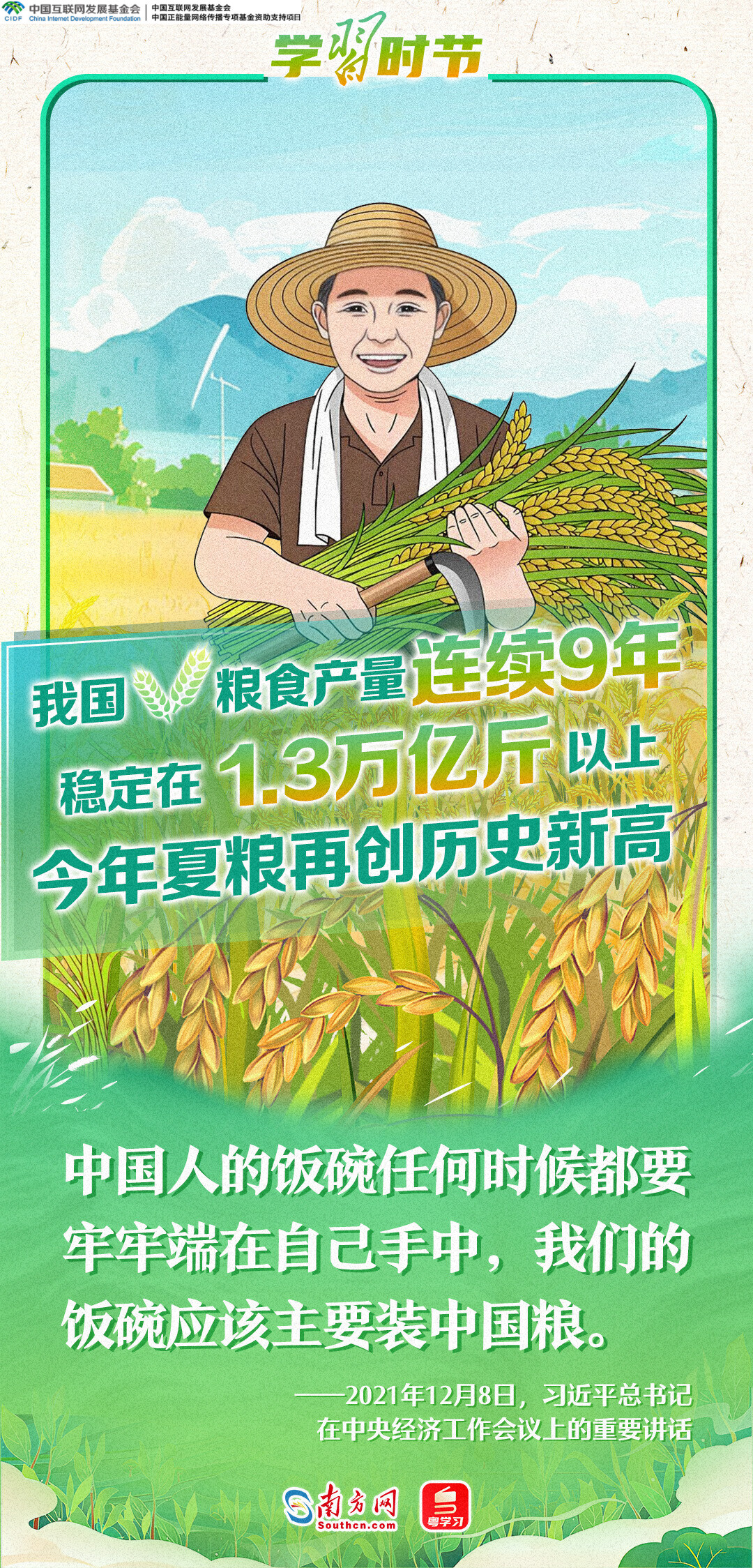 在第七个“中国农民丰收节”到来之际,中共中央总书记、国家主席、中央军委主席习近平代表党中央,向全国广大农民和工作在“三农”战线上的同志们致以节日祝贺和诚挚问候。习近平总书记强调,希望广大农民群众和社会各界都积极行动起来,一步一个脚印,把乡村全面振兴的美好蓝图变为现实,为实现农业农村现代化、建设农业强国奠定基础。