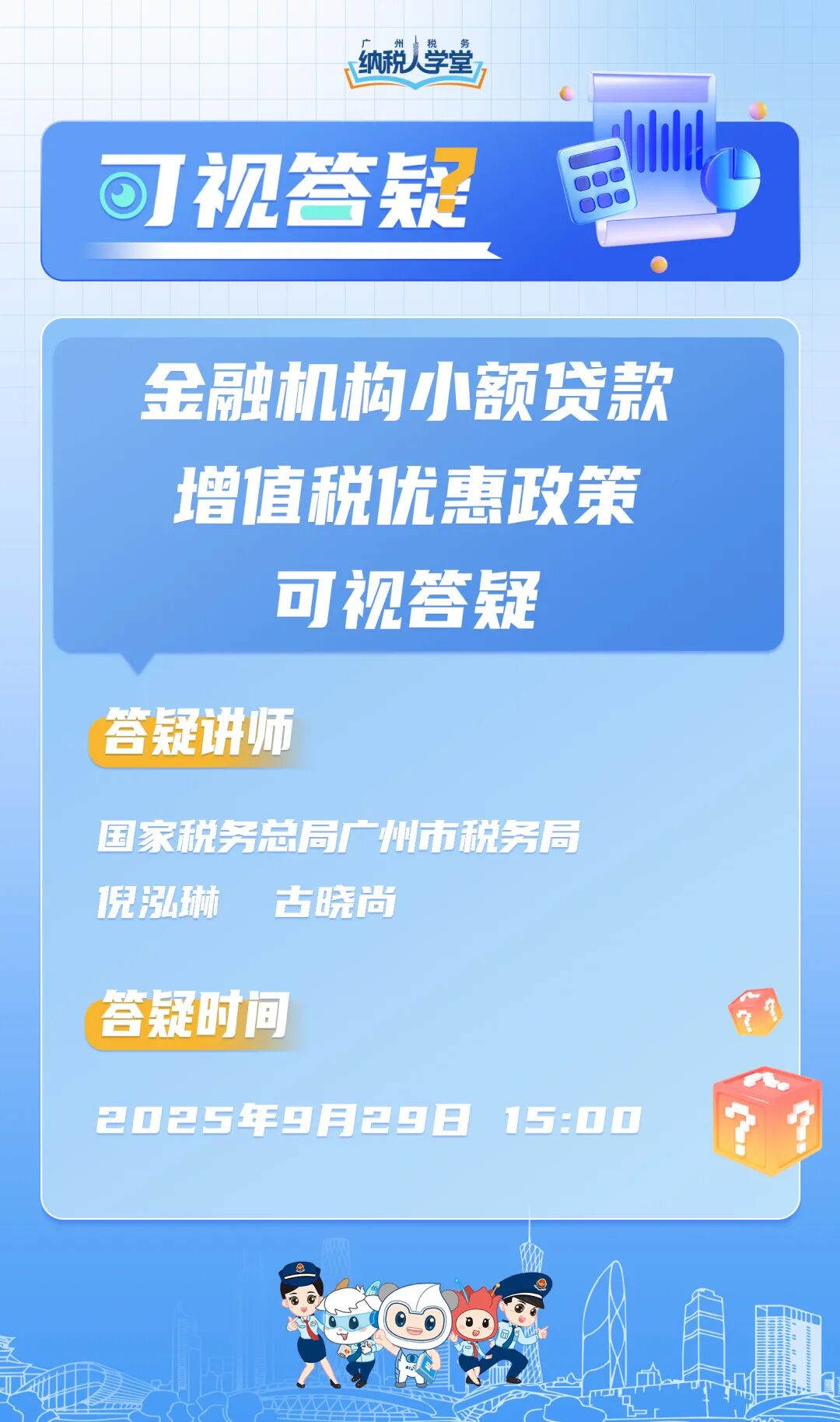 为更好帮助纳税人了解金融机构小额贷款增值税优惠政策,广州市税务局将于9月29日15:00举办金融机构小额贷款增值税优惠政策可视答疑。届时,我们将为您详细解读政策内容,并实时解答相关问题。欢迎扫描下方二维码参与互动交流。