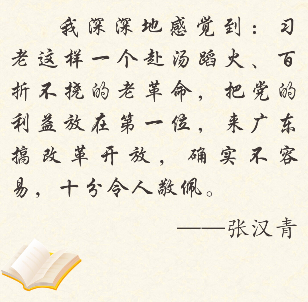 张汉青(以下简称张):习老来广东,这里的山水人文,对他来讲,是不熟悉的。对于广东的情况,南国的风土人情,来广东以后将会肩负一个怎样的责任,我想他本人也不是完全想到了的。