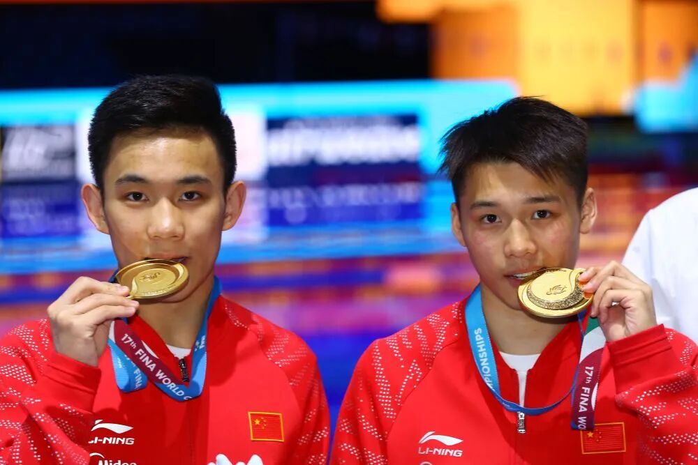 2017年7月17日,陈艾森(右)/杨昊在第17届国际泳联世锦赛男子双人10米跳台颁奖仪式上。