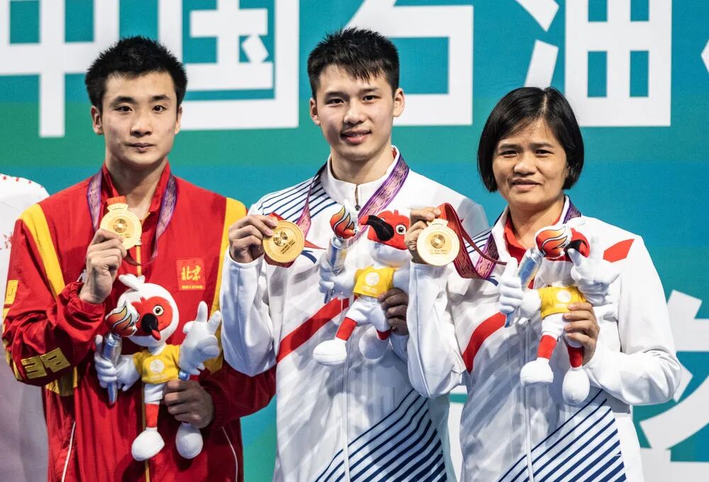 2021年9月10日,冠军联合队组合曹缘(左,北京队)/陈艾森(中,广东队)和教练员凌海婵在第十四届全国运动会跳水男子双人10米台颁奖仪式上合影。