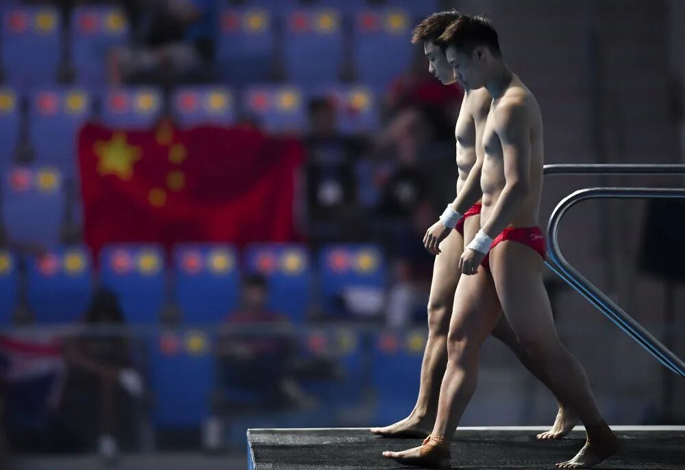 2019年7月15日,中国组合曹缘/陈艾森(前)在2019光州游泳世锦赛男子双人10米跳台决赛中。