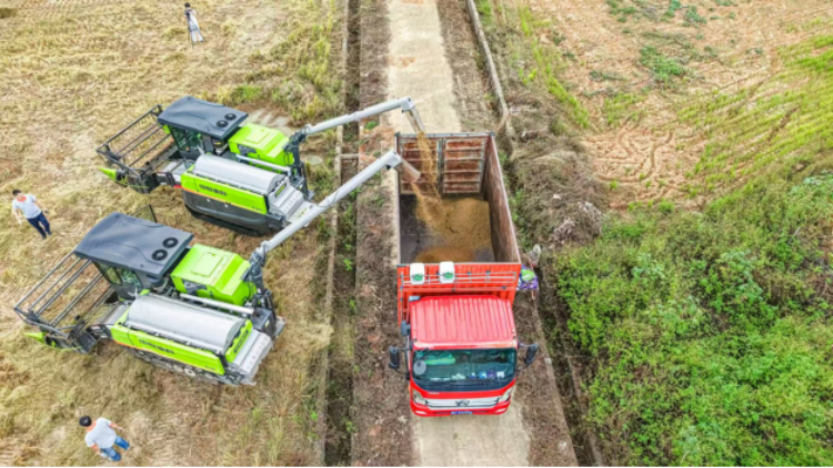 新老农机手各展神通。50多岁的刘学文轻转方向盘,履带便在狭窄田埂上稳稳调头,割台精准贴向稻株。“我家四兄弟都是农机人,已经做农业十多年,目前合作社有60多台农机。现在正值晚稻收割季,这几天都是5点起床下田,一直忙到晚上9点才收工。”刘学文表示。