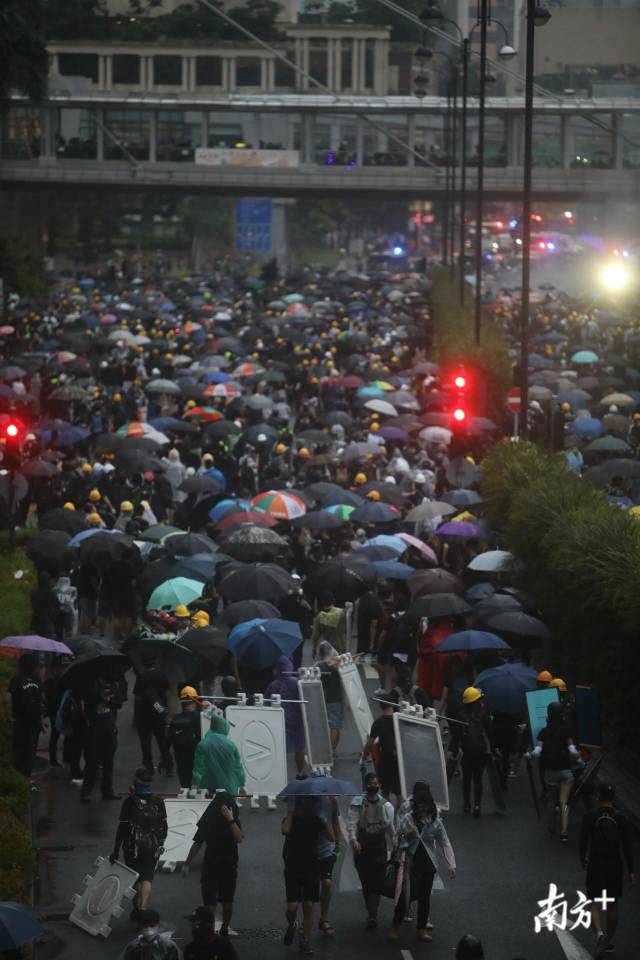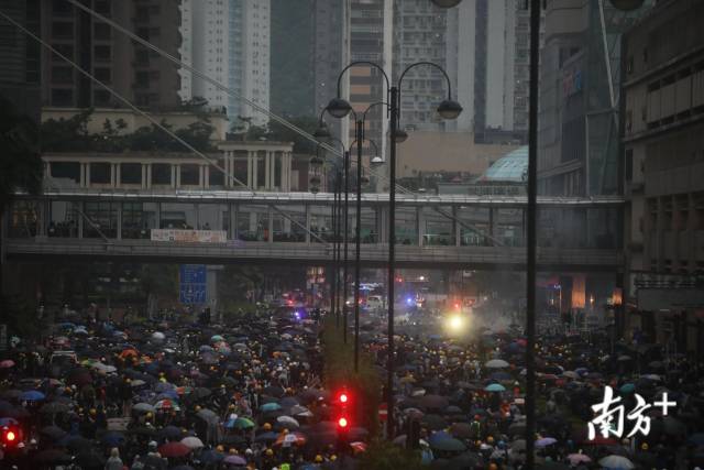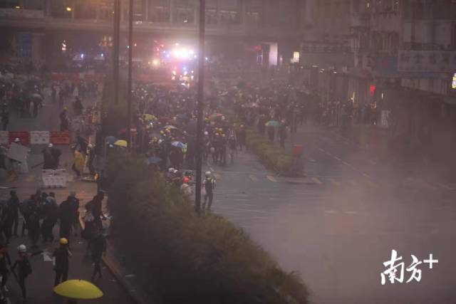 警方在多个路口设防,在杨屋道举黑旗警示后,发射多枚催泪弹,示威者被稍微逼退。记者在现场了解到,警方已经在外围布置水炮车戒备,这是警方首次在示威清场中出动水炮车。