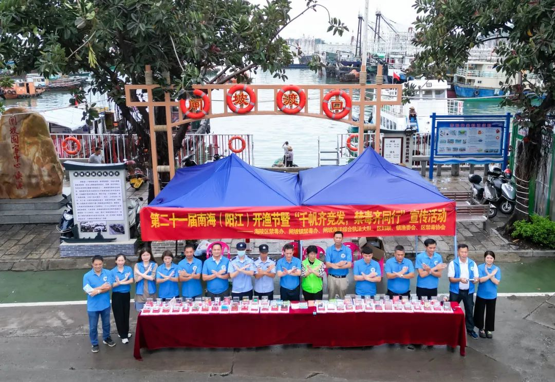 为了提升渔民群体及游客的识毒、防毒、拒毒意识,杜绝海上贩卖、运输毒品等违法现象,由阳江市海陵区禁毒办牵头组织,海陵区妇联、闸坡镇禁毒办、闸坡海洋综合执法大队、闸坡镇渔委会、海陵区禁毒协会共同开展第二十一届南海(阳江)开渔节暨“千帆齐竞发,禁毒齐同行”宣传活动。