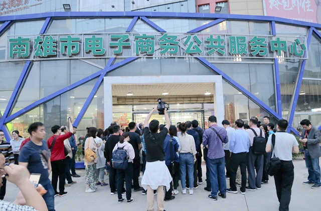 采访团在南雄市电子商务公共服务中心调研当地发展农村电商、助力脱贫攻坚的成果。