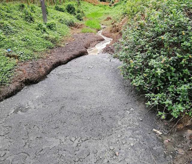 3月25日,记者实地探访丁香冲村,入村就闻到一股股浓烈的熏臭味。几名丁香冲村民带着记者来到稻田边,记者看到渠沟流水呈酱黑色,靠近田沟的庄稼、野草都已枯萎。而污水来源,就是上游的一个养猪场。