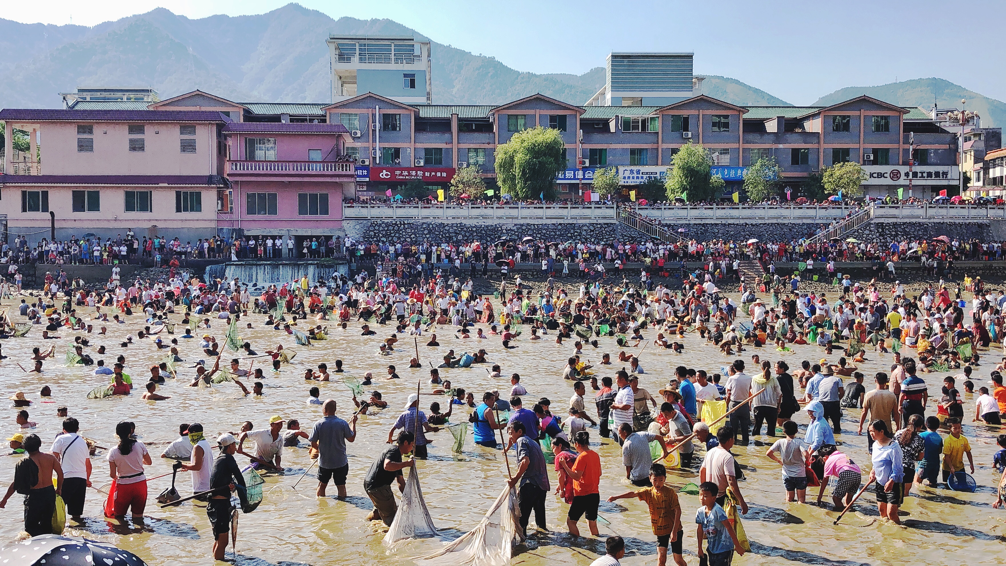 9月22日下午三点,在连南瑶族自治县三江河流域,超过一万名群众集中在河流中及河岸两侧,他们进行趣味性十足的“万众渔乐”活动。