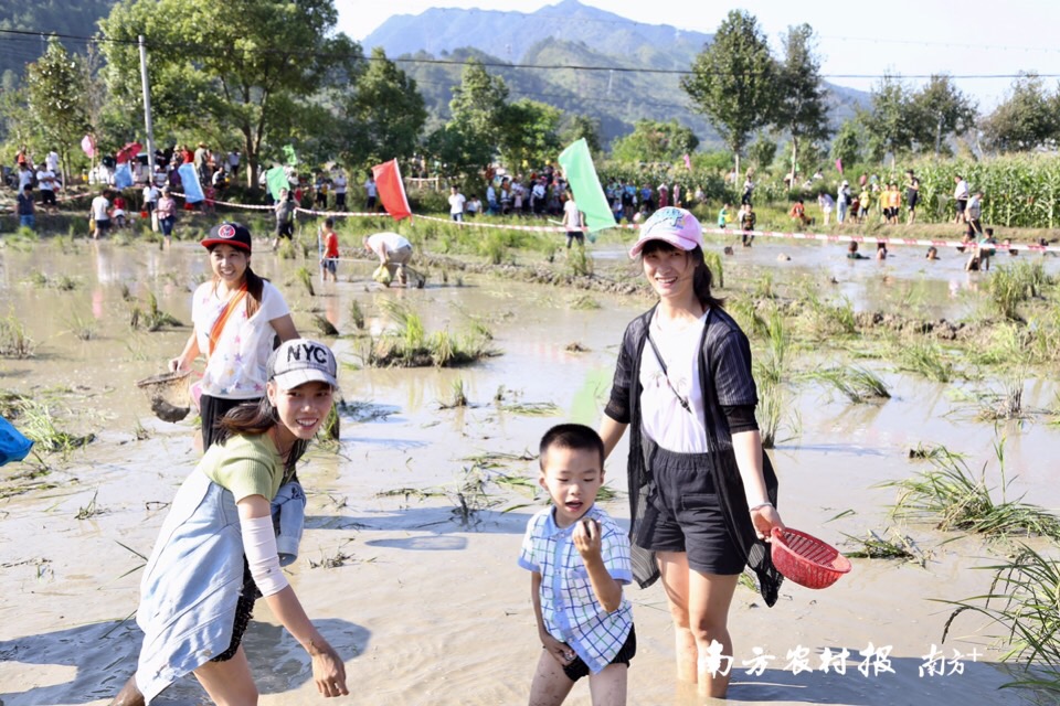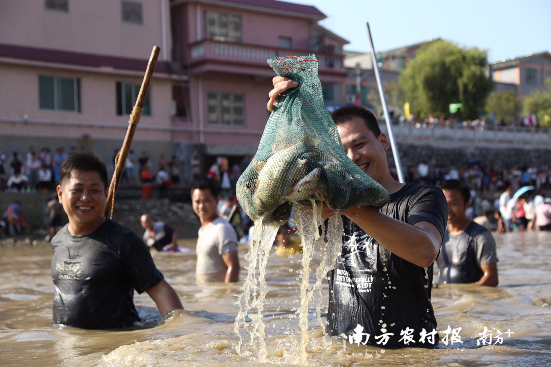 在数百米的活动河域,群众捕鱼奇招频出,有的人直接将鱼装进裤子口袋,有的直接用上衣网鱼,有的一手捉一条鱼走向岸边,脸上洋溢着丰收的喜悦。捉鱼活动可不止这一处,在三江镇沿陂桥附近,一片金黄稻浪中,广东连南第六届稻田鱼文化节“田间徒手捉鱼、摸田螺活动”在一阵欢声笑语中开始了。