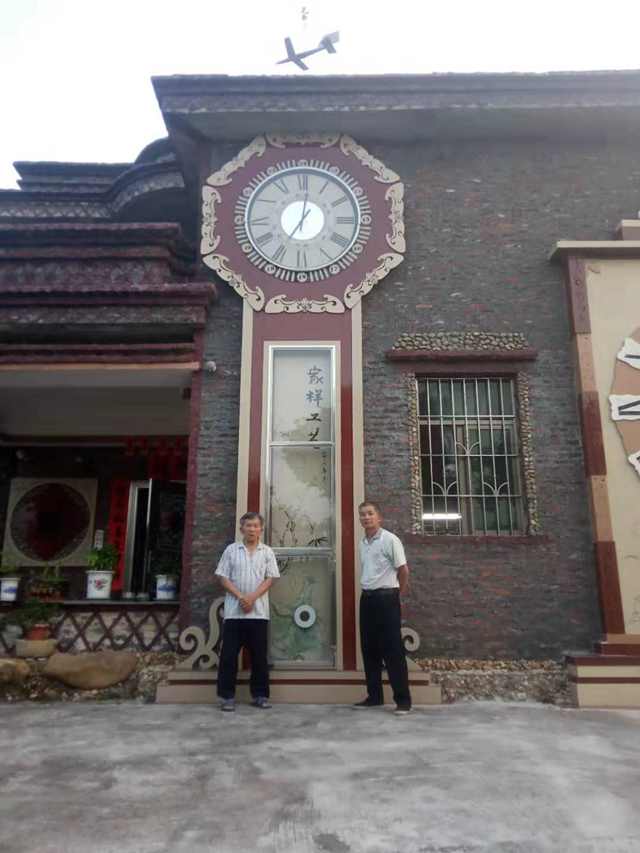 房屋外墙的两座近6米高的机械大钟,瓷砖底钟面的粘贴、雕刻与绘画,均由父子二人配合完成。从花纹的雕刻、色彩的搭配到底画的绘制,无不彰显制作者的良工苦心,对钟表的喜爱之情可见一斑。