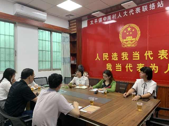 熊晓冬(右二)在清远市清新区中南村跟驻村干部、帮扶企业等座谈。