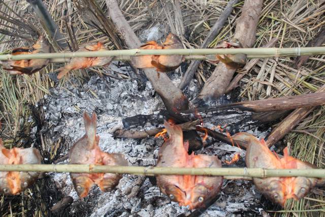 红彤彤的炭火烧烤炉,架上鲜嫩可口的肉串和肥美的稻田鱼,滋滋冒着油花,再撒上孜然香料……听着音乐,吃着烧烤,两个字——满足!