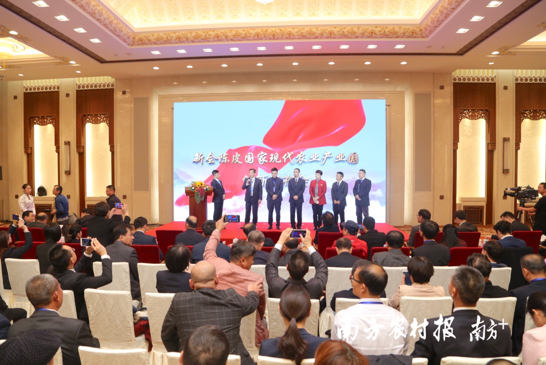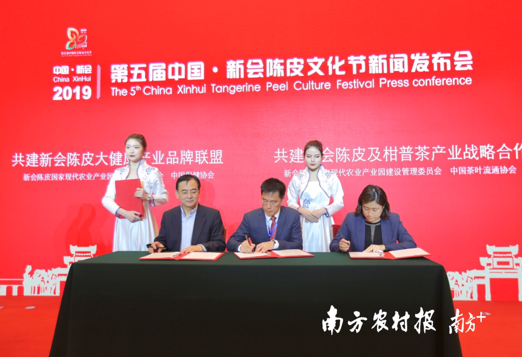 签约仪式此外,发布会进行了第五届中国·新会陈皮文化节启动仪式,据梁明建介绍,第五届中国·新会陈皮文化节将于11月8日在新会陈皮现代农业产业园开幕,本届文化节将围绕“产业、生态、健康、富民”这一主题,精心策划多场系列活动,今天上午举行的新闻发布会即是其中之一,此外,还将举办第七届中国·新会陈皮产业发展论坛、第五届中国·新会陈皮文化节开幕式、第五届新会陈皮(柑茶)博览会、第三届新会陈皮收藏节、产业联盟及产品采购对接、陈皮美食比赛等多种主题活动,向外界展示新会陈皮产业最新发展成果和新会陈皮国家现代农业产业园发展成效。