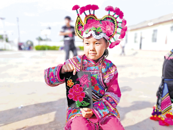 彝族小姑娘李润向记者展示其绣成的山茶花。