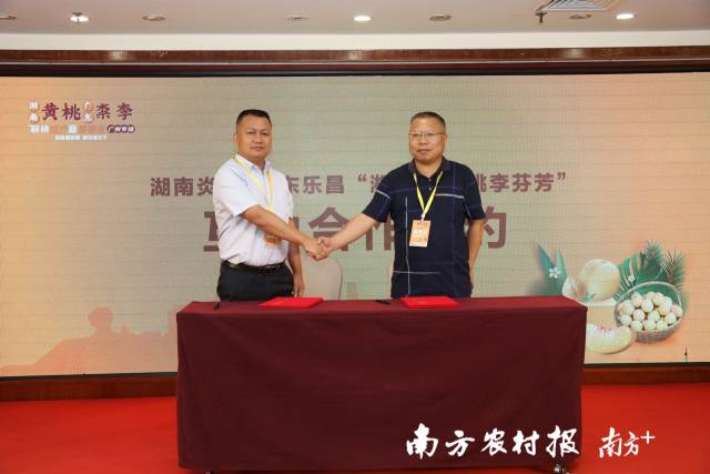 湖南炎陵县农业农村局副局长李春生和广东省乐昌市现代农业产业发展中心主任沈鸿云就两地互助合作进行签约