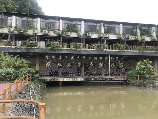 “山清水秀吉祥地,人杰地灵幸福村”。穿过牌坊,便是下迳村可容纳百人的民宿,民宿背后是掩在绿树中大小不等的十数个汤泉。农业观光、民宿、汤泉与拓展基地是下迳村乡村旅游经济合作社当前的主要服务项目。眼前经营得有声有色的风景区,正是村民们一砖一瓦建设出来的。