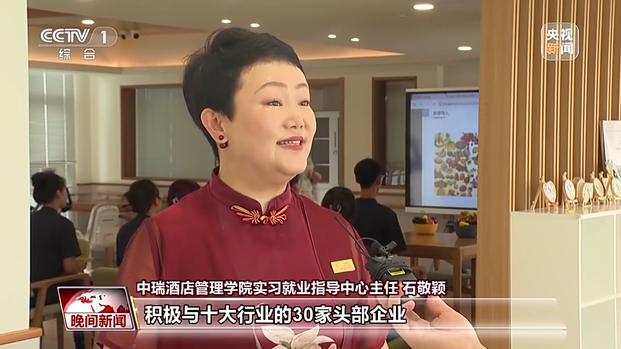 中瑞酒店管理学院实习就业指导中心主任 石敬颖:积极与十大行业的30家头部企业签订了人才培养战略合作协议,每次的毕业生的招聘会,我们都会吸引30多个行业的200多家企业参与,会为毕业生提供3000多个就业岗位。