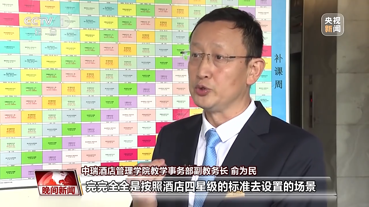 中瑞酒店管理学院教学事务部副教务长 俞为民:完完全全是按照酒店四星级的标准去设置的场景,学生在这里学习的工作环境就是跟酒店完全融合在一起的。